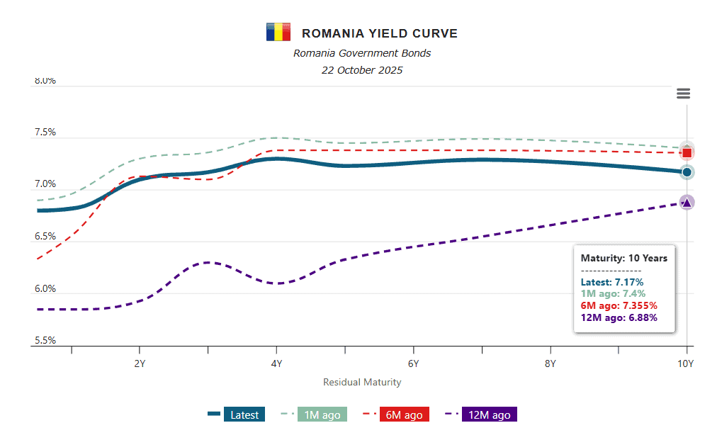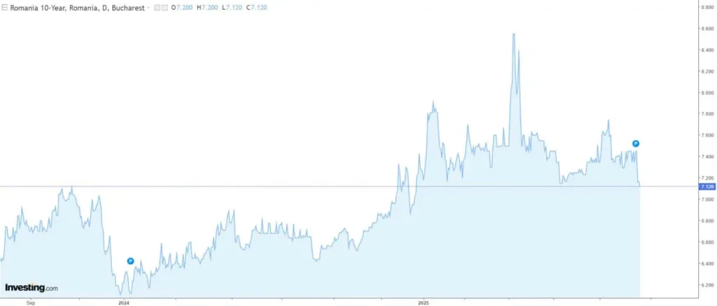 Prima de risc a României s-a ameliorat în ultima săptămână, dobânzile la obligațiunile guvernamentale în lei scăzând la cel mai mic nivel din acest an după trecerea de CCR a Pachetului 2 de măsuri fiscale pentru corectarea deficitului bugetar, respectiv după rămânerea în funcție a premierului Ilie Bolojan, în contextul declarării reformei pensiilor speciale ale magistraților ca neconstituțională.